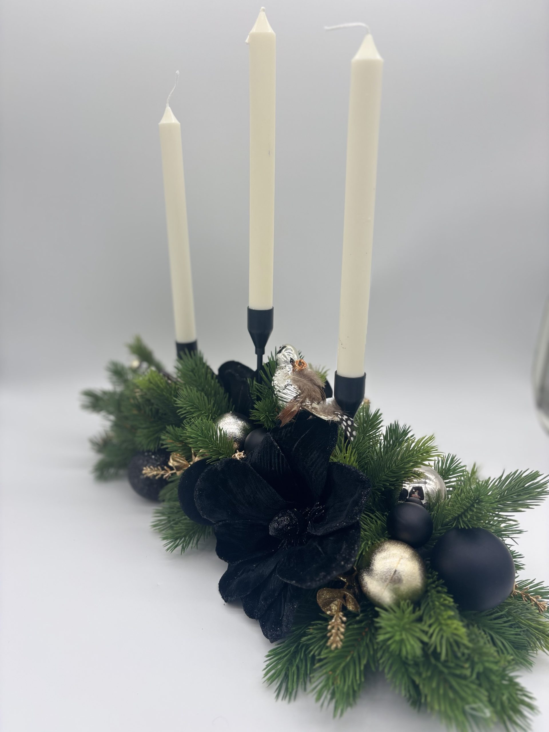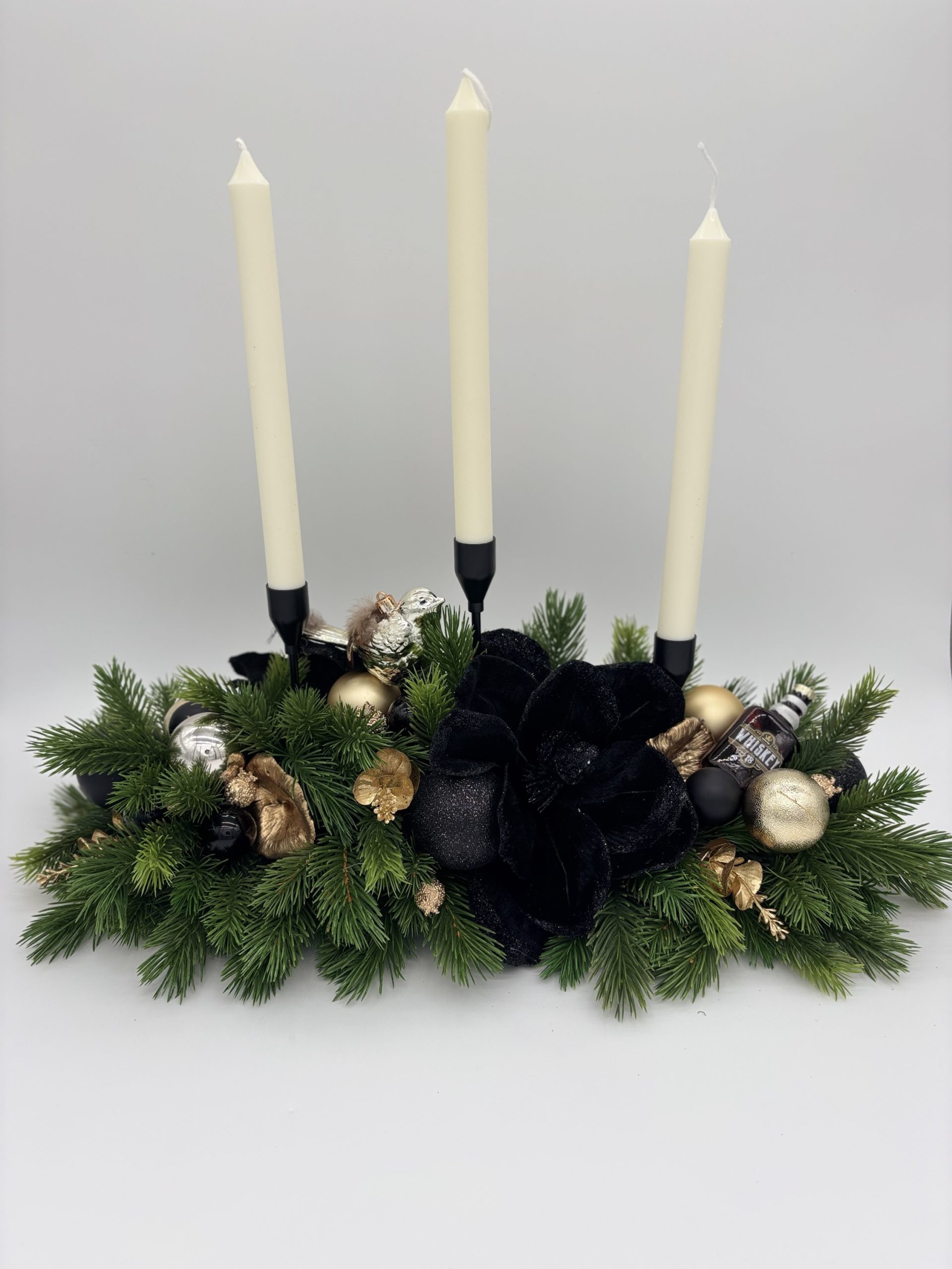 Elegantiška rankų darbo kalėdinė dekoracija-žvakidė su trimis žvakėmis ir šventiniais papuošimais. Ši kalėdinė stalo dekoracija sukurta derinant dirbtines eglės šakeles, juodus, auksinius akcentus, kurie suteikia prabangos ir šilumos jūsų namams.