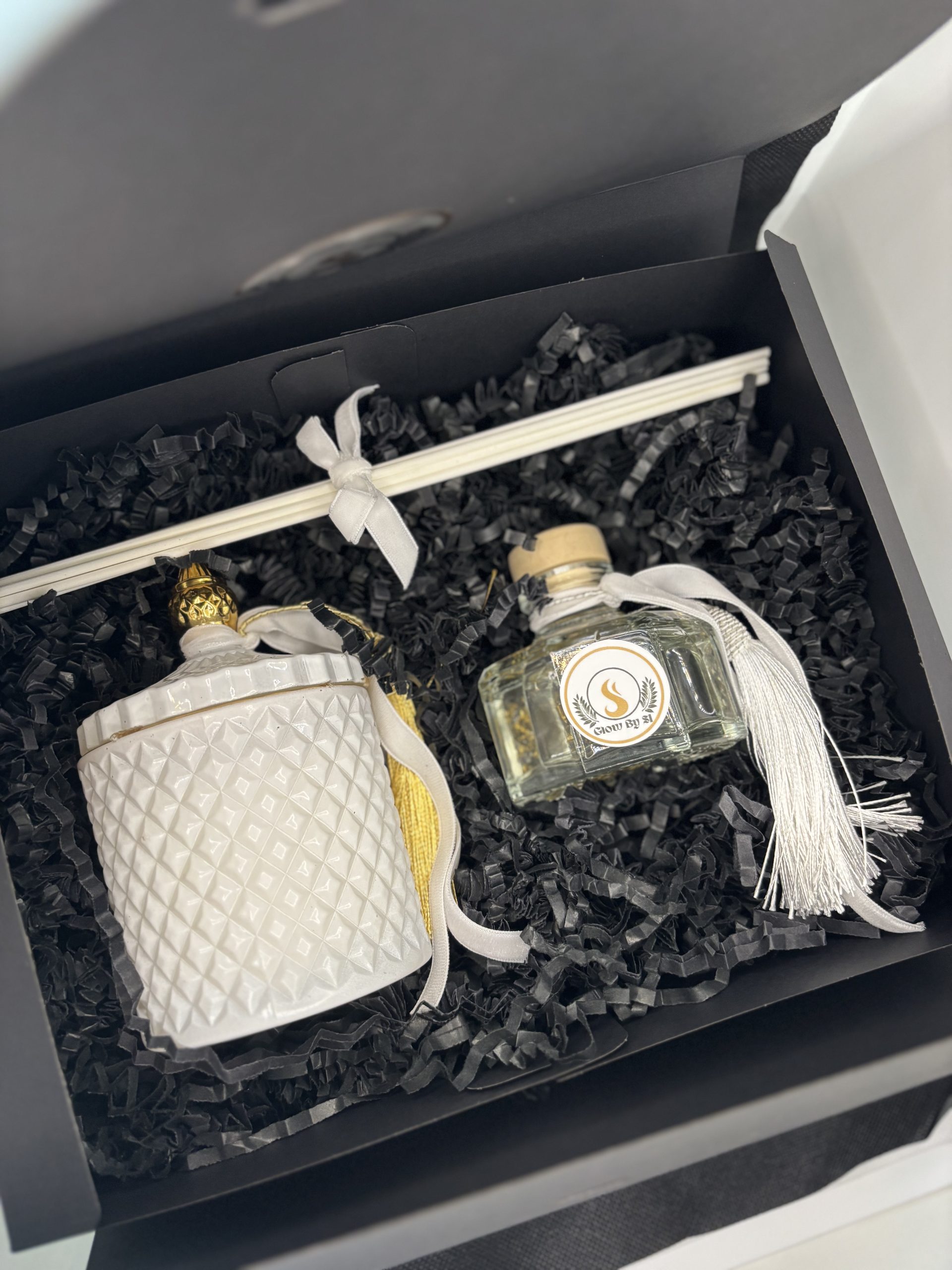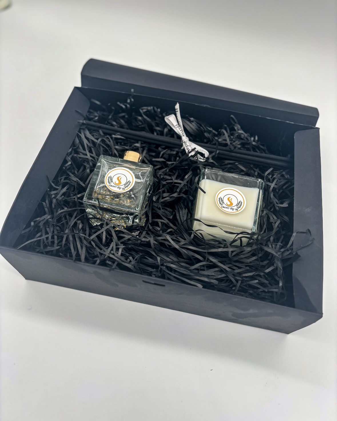 Pasirinkę paslaugą „Supakuoti kaip dovaną“, galite susikurti savo unikalų rinkinį iš kelių žvakių ar namų kvapo. Jūsų pasirinkti produktai bus suderinti ir supakuoti į estetišką dėžutę, kurios dydis bus parenkamas pagal rinkinio turinį ir bendrą stilių. Nuotraukoje pateiktas vienas iš pavyzdžių, kaip gali atrodyti supakuota dovana. Norėdami pasinaudoti šia paslauga, įsidėkite prekę „Supakuoti kaip dovaną“ į krepšelį kartu su pasirinktais produktais – visos krepšelyje esančios prekės bus supakuotos kaip viena dovana.